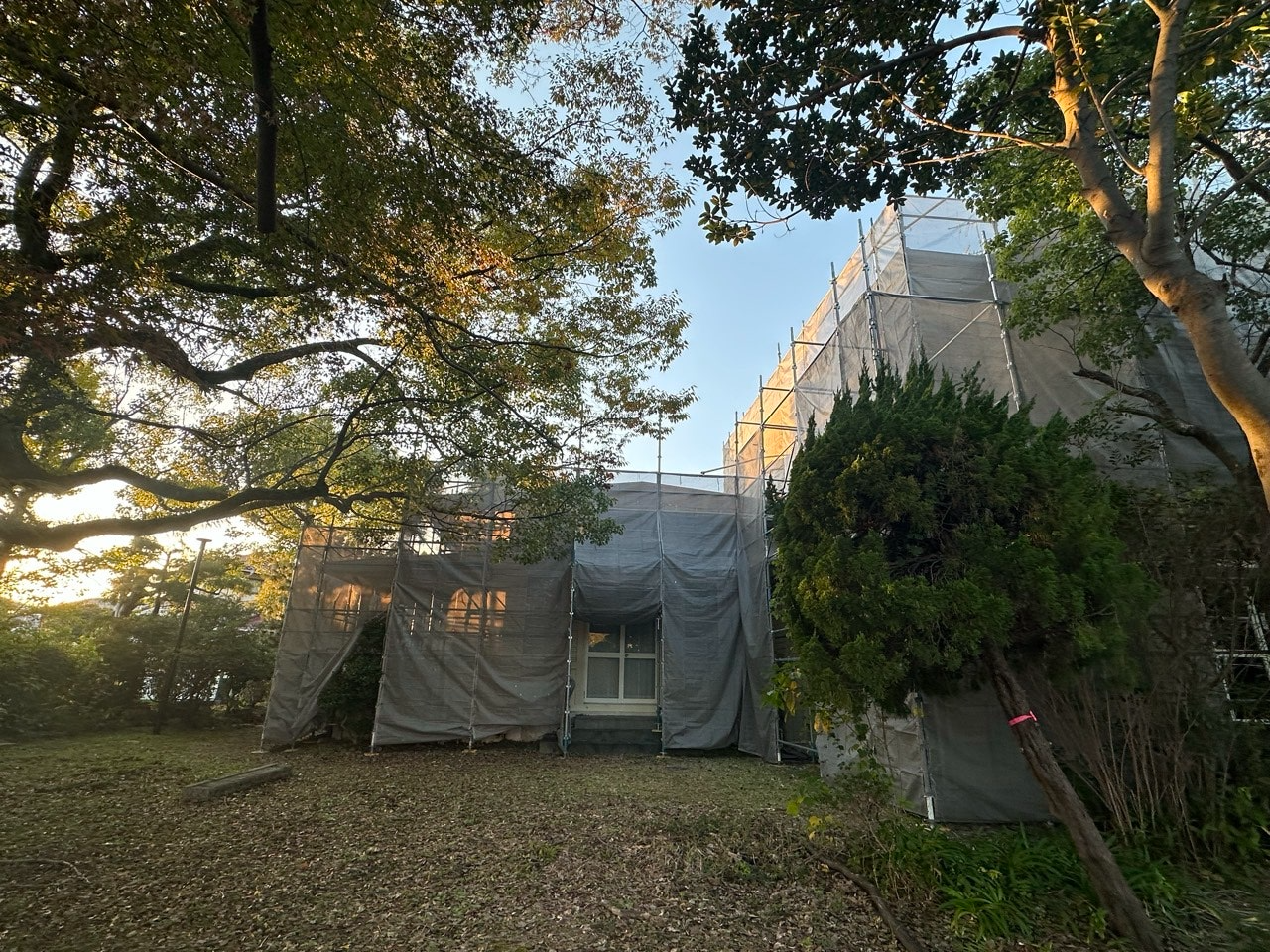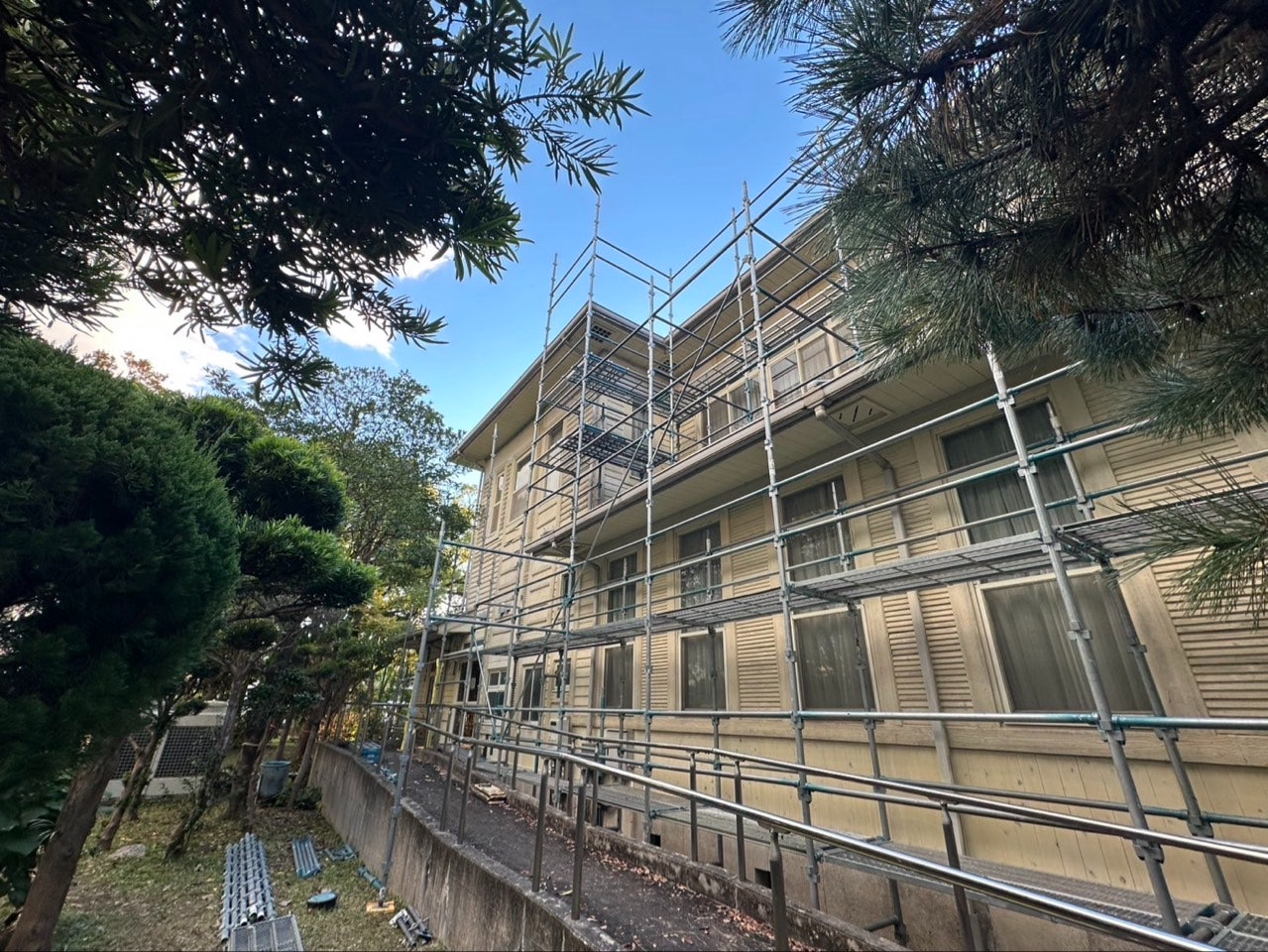 昨日に引き続き大学構内の足場組立を行っております。