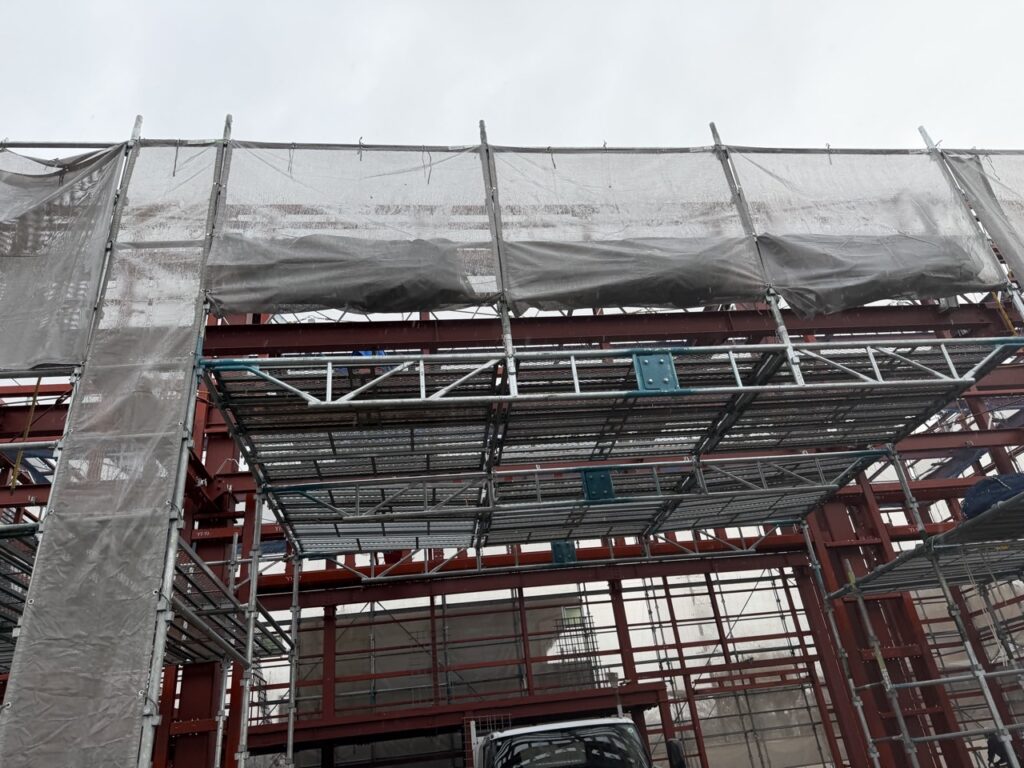 本日は先日足場架けを行った現場での追加工事を行いました。 今回は先日ステージ足場を設置した間に開口足場を追加しました。 雨天時の作業だったためより安全に気を付け作業しました。