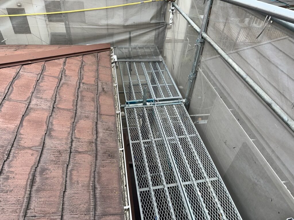 本日は屋根部分修復のための昇降足場工事を行いました。 今回は修復材を屋根上にあげるための足場のためステージも設置し、一時置き場として使えるようにしました。 屋根渡りに手摺を2段つけ、安全面も考慮しました。
