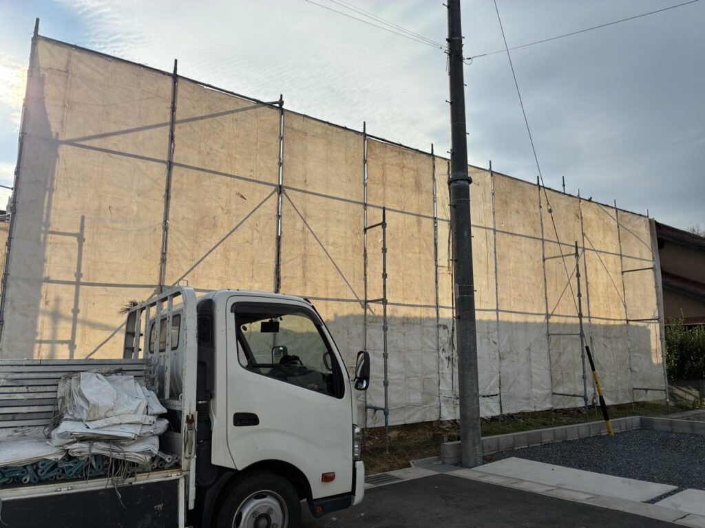 本日は住宅解体用の足場組を行いました。 今回は解体時に使用する足場ではないためアンチは入れてません。 白シートを隙間なく張り、粉塵等防止のための足場を設置しました。 アウトリガーを使用し、倒壊防止に努めました。