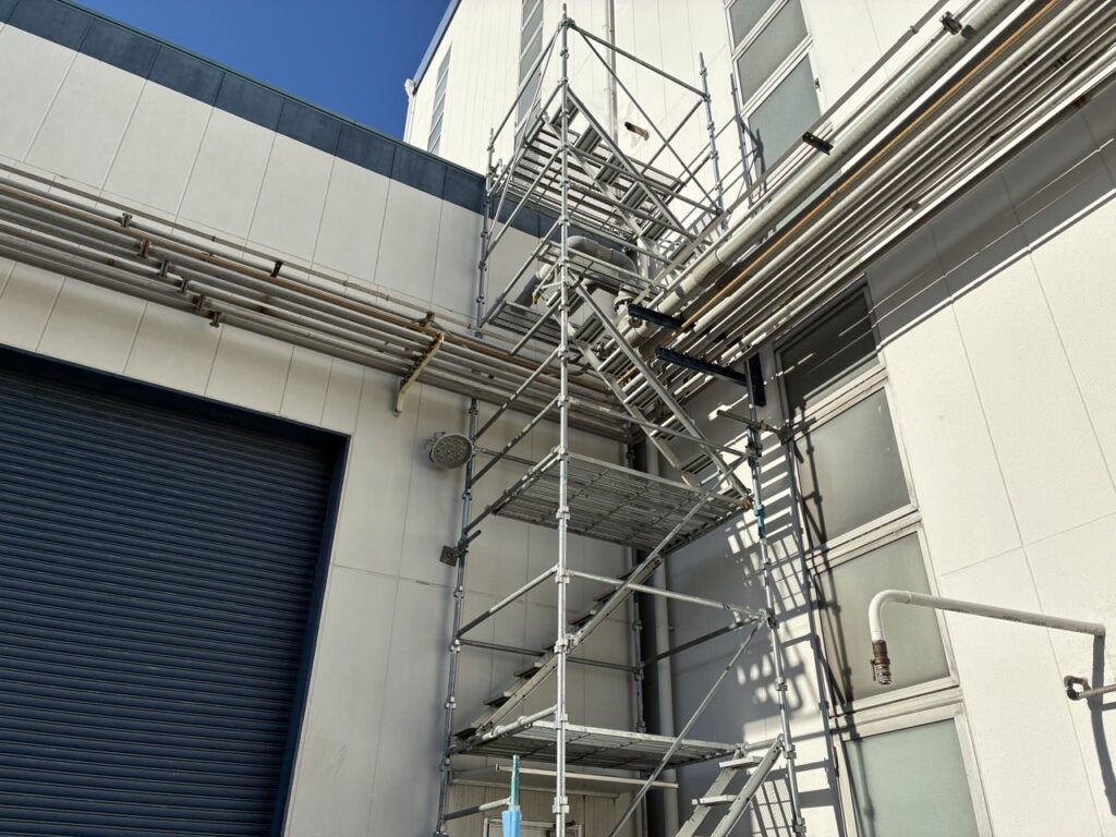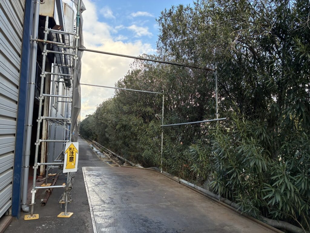 本日は工場外部へ部分足場工事を行いました。