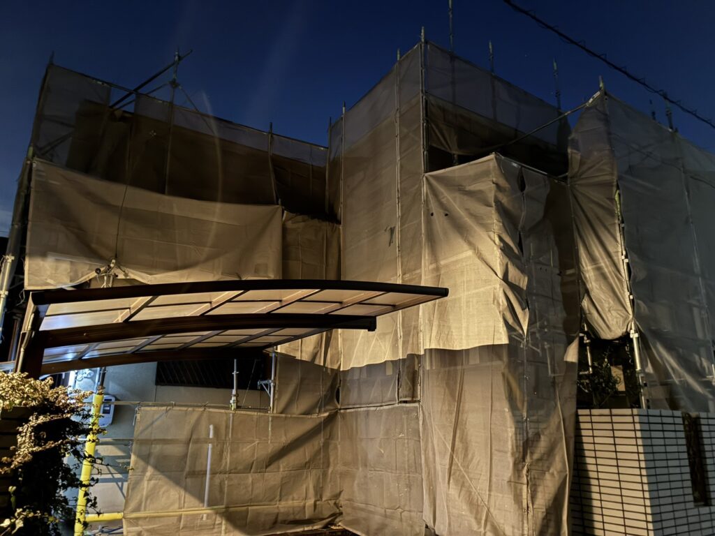 今回は壁の塗り替えに加えて、窓枠の交換のための足場も設置しました。